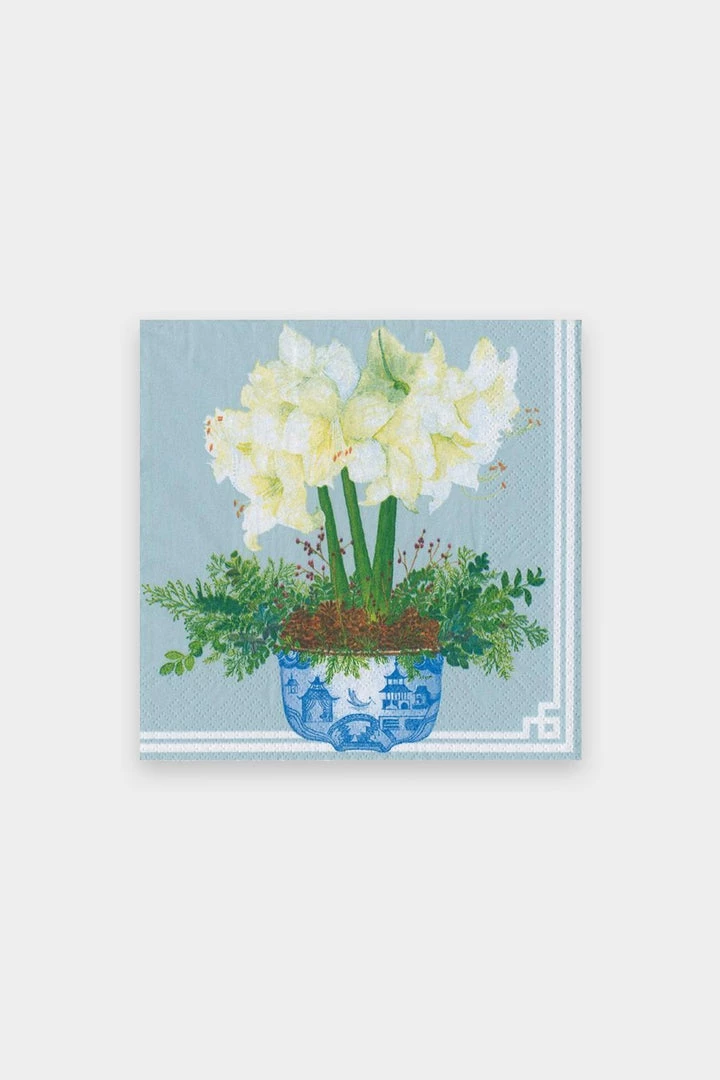 Potted Amaryllis Paper Cocktail Napkins in Pale Blue by Caspari