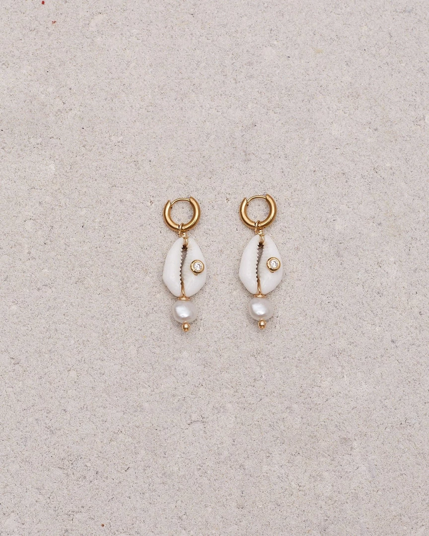 Cowrie Shell and Farmed Freshwater Pearls on Gold Plated Hoop
