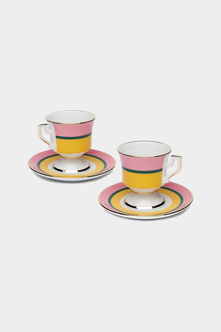 Made in collaboration with Italian porcelain greats, Ancap, this set of two espresso cups and matching saucers is made from the highest quality Italian porcelain with a hand-painted 18K gold trim. Set on delicate saucers, each cup is splashed with three happy-making hues