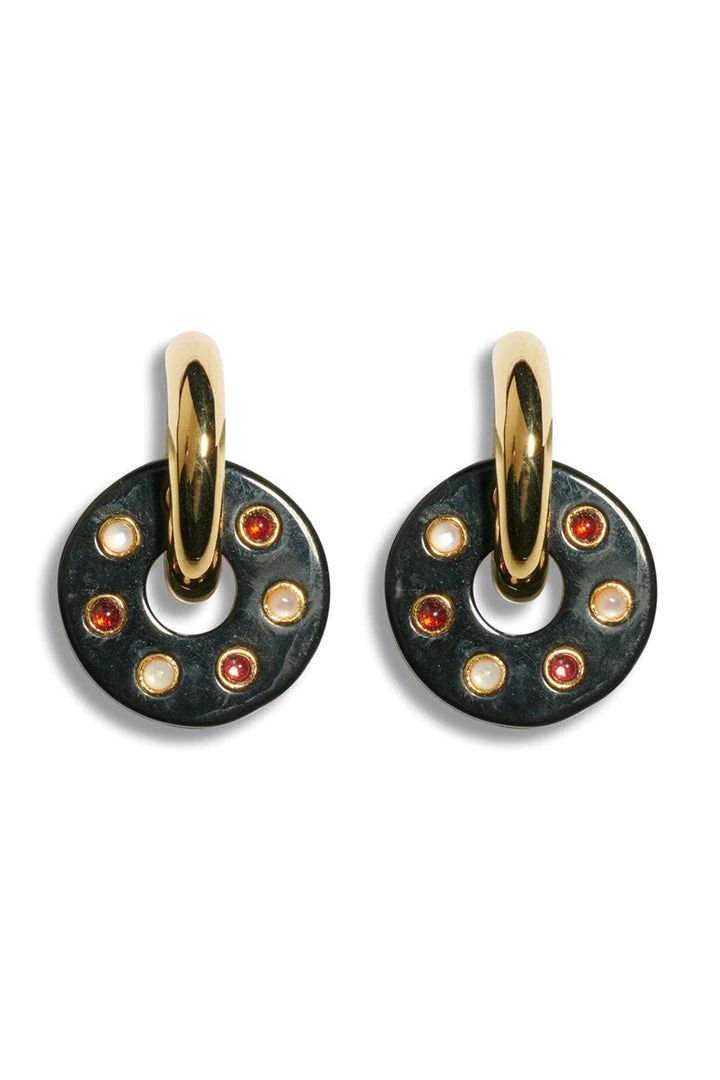 - Composition: Gold-plated brass, acrylic, garnet, tourmaline, mother-of-pearl