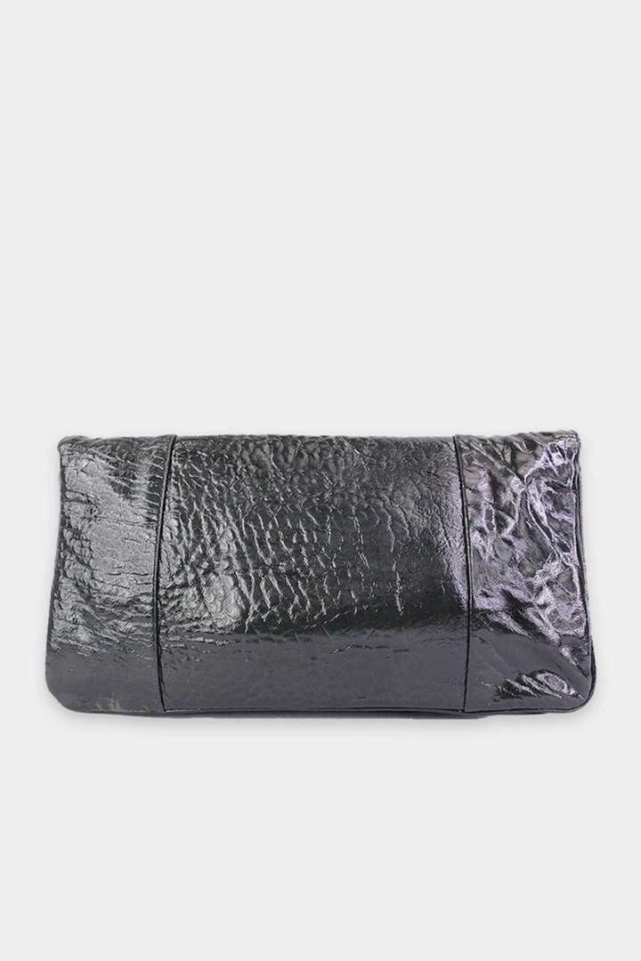 - Medium sized dark green patent leather clutch.
