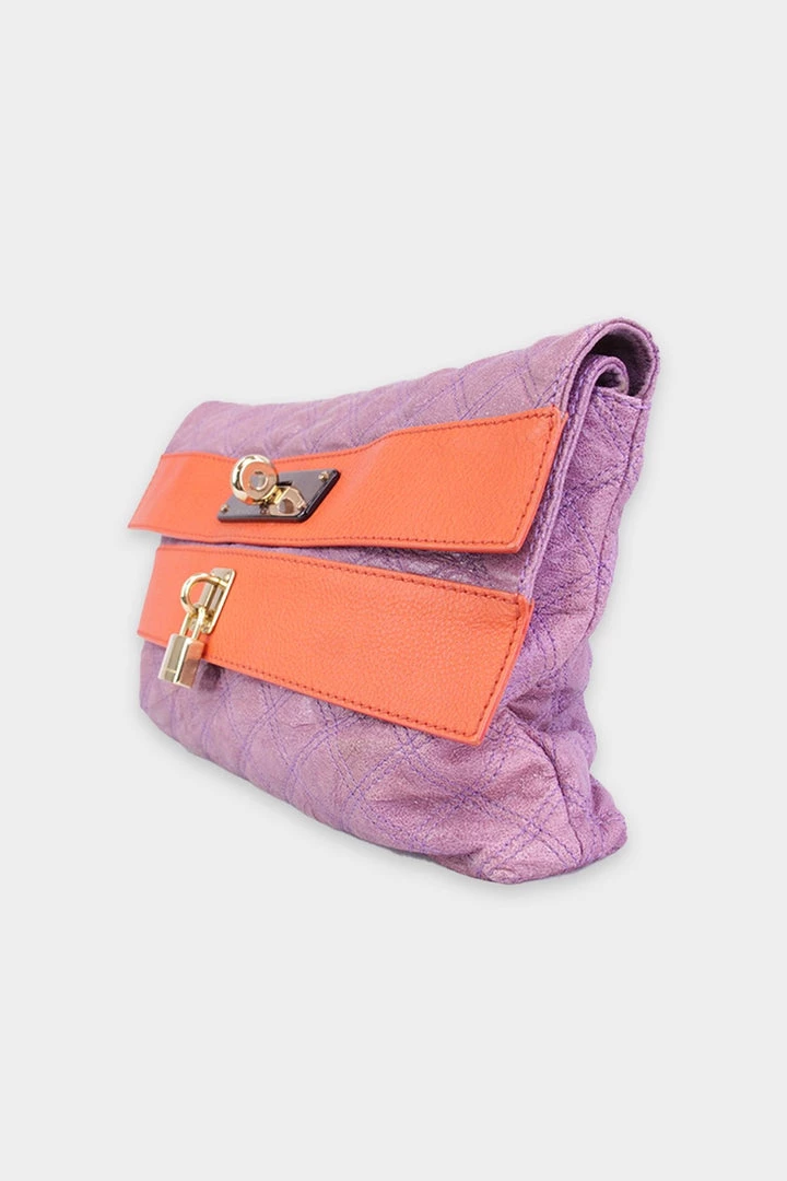 - Lavender and orange oversized fold over clutch.
